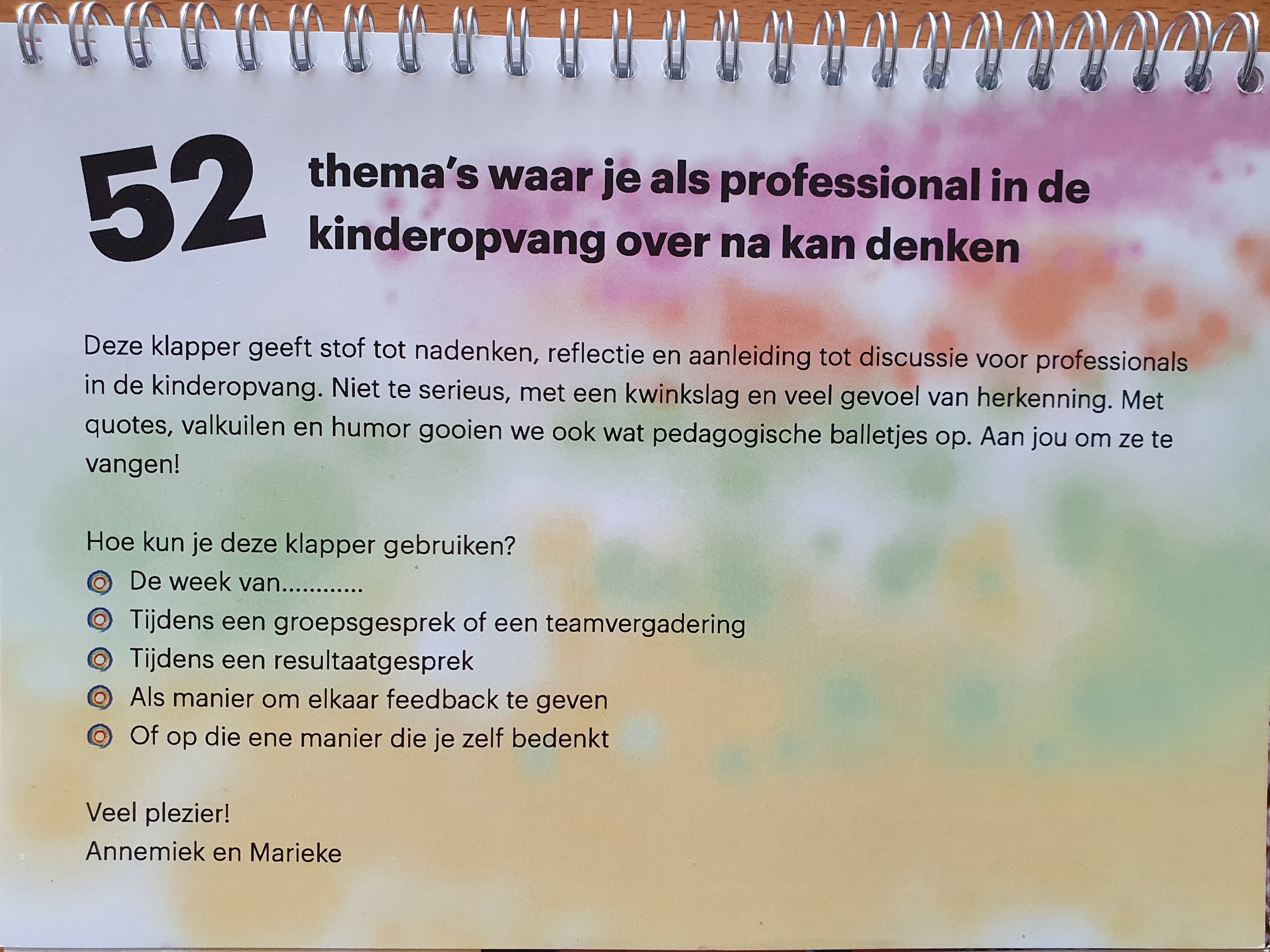Dit boek moet je lezen want, het is een klapper met 52 thema's als inspiratie. Als pedagogisch coach stuur ik elke week een thema naar de pedagogisch medewerkers en daar wordt heel enthousiast op gereageerd. De thema's zijn herkenbaar en met humor geschreven.