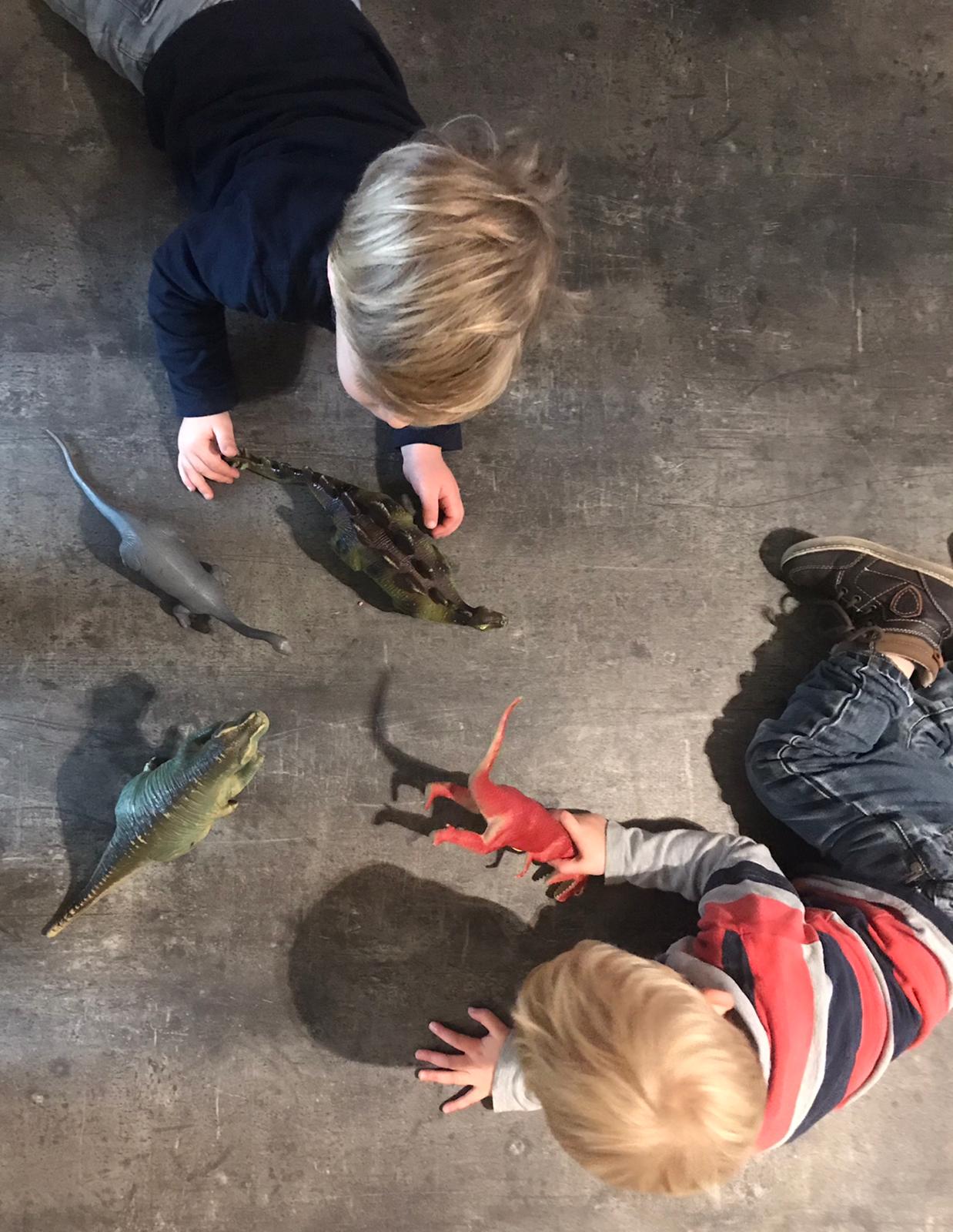 Een week later zijn de dino’s aan de beurt. Op hun knieën voor de bank, de blauwe kussens zijn het land van de dino’s, we horen dat het er gevaarlijk is. Kilometers worden afgelegd door de dino’s en de jongens op hun knieën. De pm’er stelt vragen en elke vraag wordt beantwoord, maar ze laten zich niet afleiden, hun samenspel en interactie gaat verder. Wat een concentratie, wat een spelbeleving en wat een taal. De jongens begrijpen elkaar met en zonder woorden. Een ander kind dat aan komt schuiven wordt geaccepteerd, mag meespelen en krijgt zijn rol en spelmateriaal toebedeeld. Zonder woorden voegt hij in en zo vertrekt hij ook weer vijf minuten later. Stan en Wart kijken hem na en gaan weer verder met hun spel.